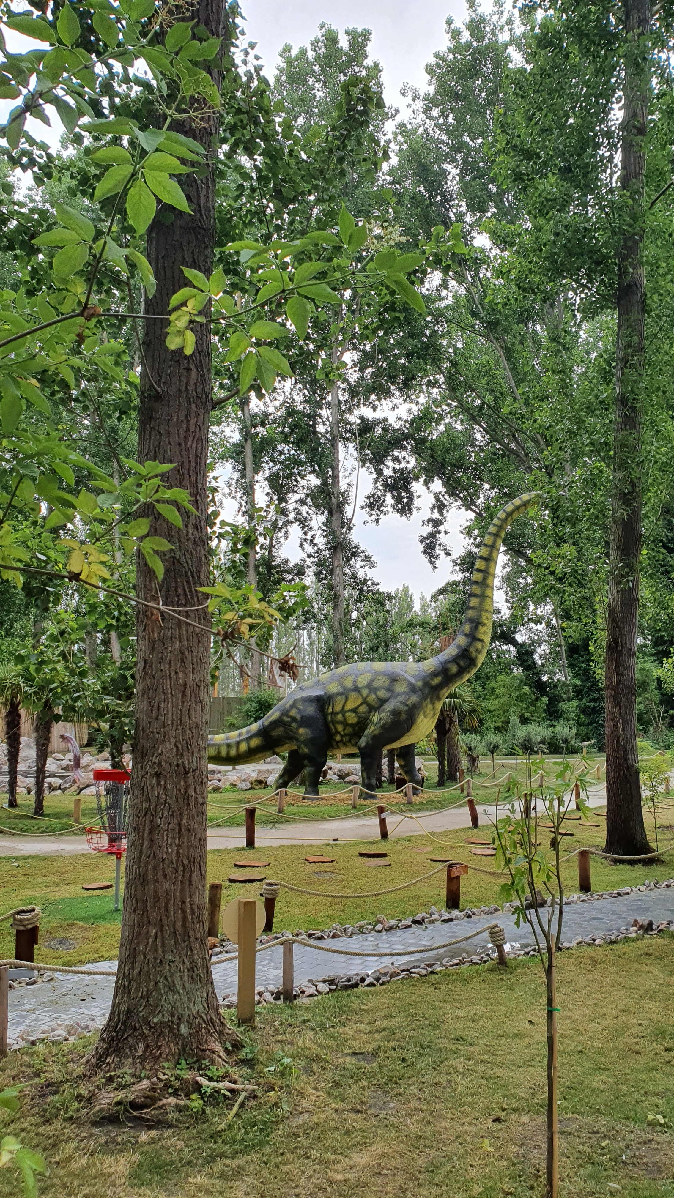 Une visite a faire qui plaira aux enfants. (Ici 3 ans) Assez rapide (45 min en lisant les panneaux explicatifs), mais il est possible de refaire autant de fois le tour que l'on désire, parcours rendu ludique avec le disc golf (envoyer son frisbee dans un panier). Gratuit pour les enfants de moins de 5 ans sinon c'est 5 euro, possibilité de louer une voiturette avec un supplément (visite plus courte du coup, un petit quart d'heure). Totale immersion avec de belles allées , une jolie décoration en perpétuelle amélioration. Alors oui les dinosaures sont immobiles, mais très réalistes. Le personnel est très sympathique. C'est a faire au moins une fois !